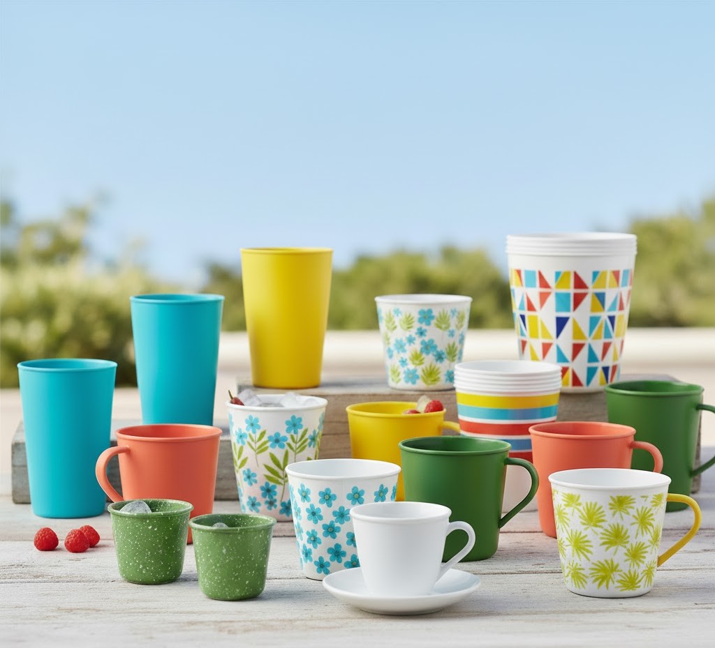 Durable, heat-resistant melamine cups for all purposes.